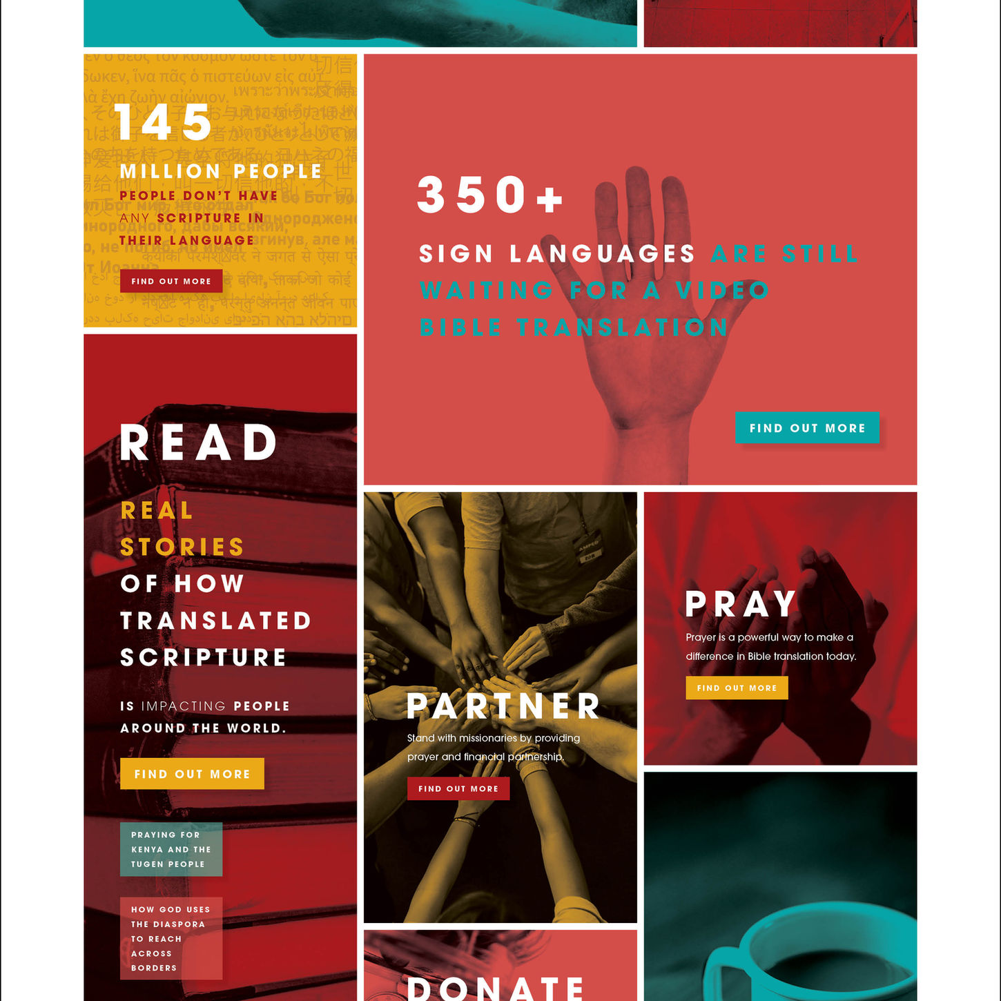 Like the Instagram ads (see Marketing subpage) created for Wycliffe, a non-profit organization that translates the Bible into a variety of languages, this home page redesign is inspired by Wycliffe's current website. The majority of photographs used were sourced from Unsplash. All headings and text included in the graphic were taken directly from Wycliffe's [current] homepage.
